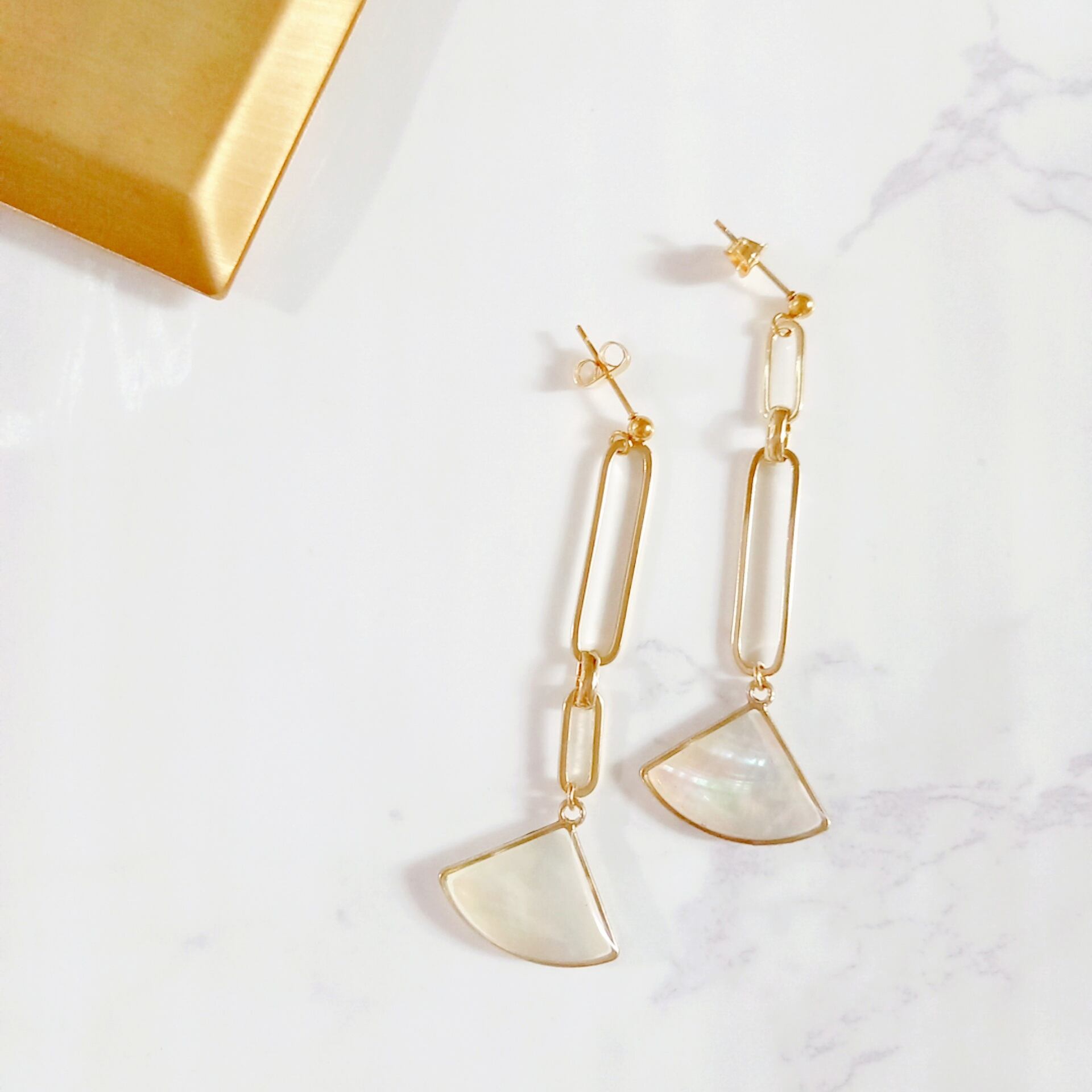 大ぶりのデザインチェーンにシェルパーツが揺れるピアスです。