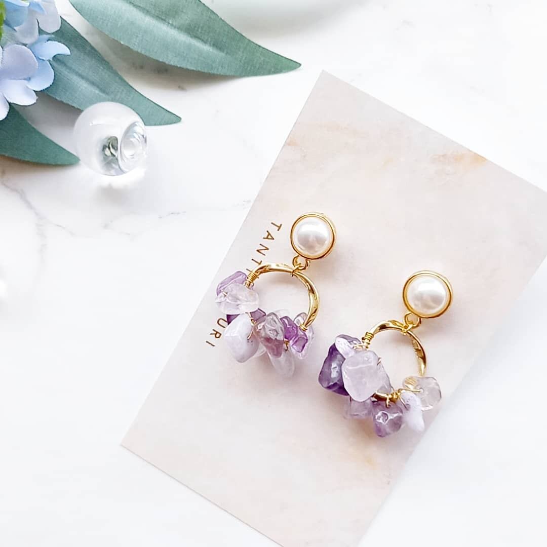 天然石ピアス アメジストサザレ デザインフープ&パール○イヤリング交換可能