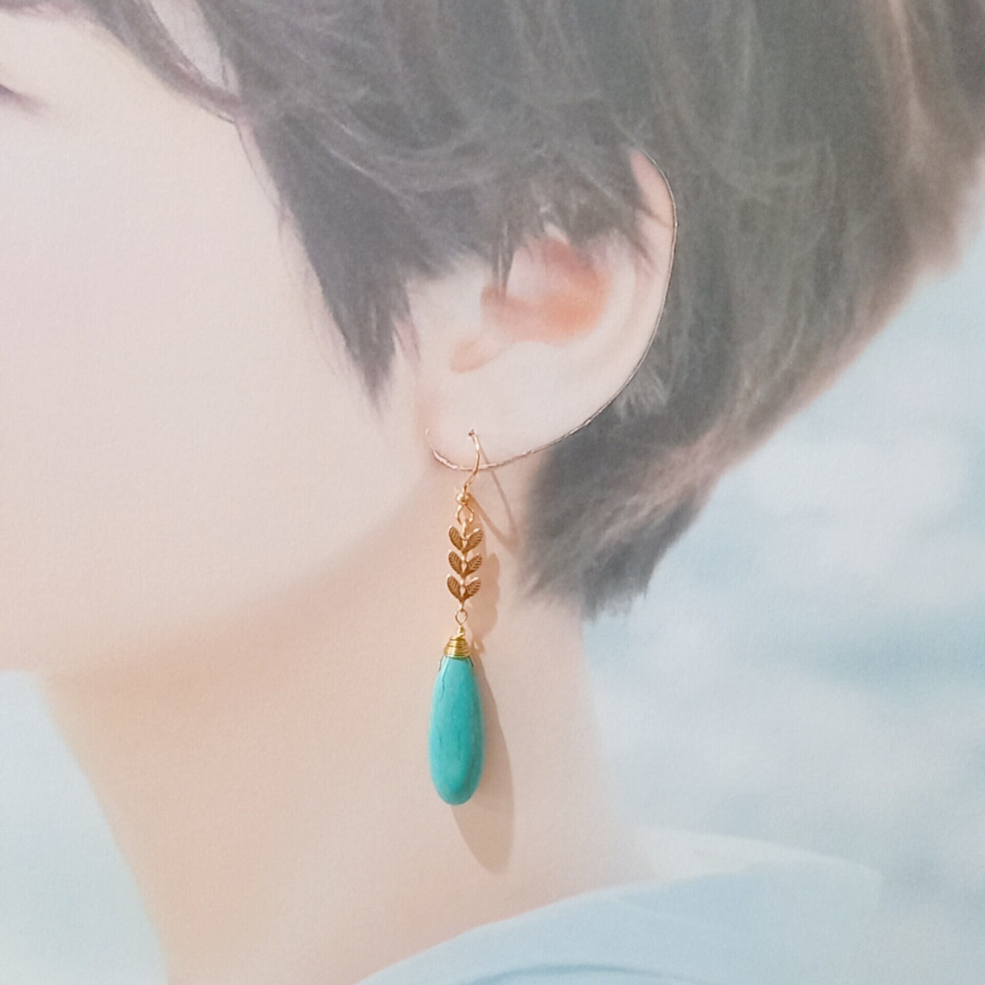 青緑色が魅力的な天然石ウイグル産ターコイズのティアドロップピアスです。