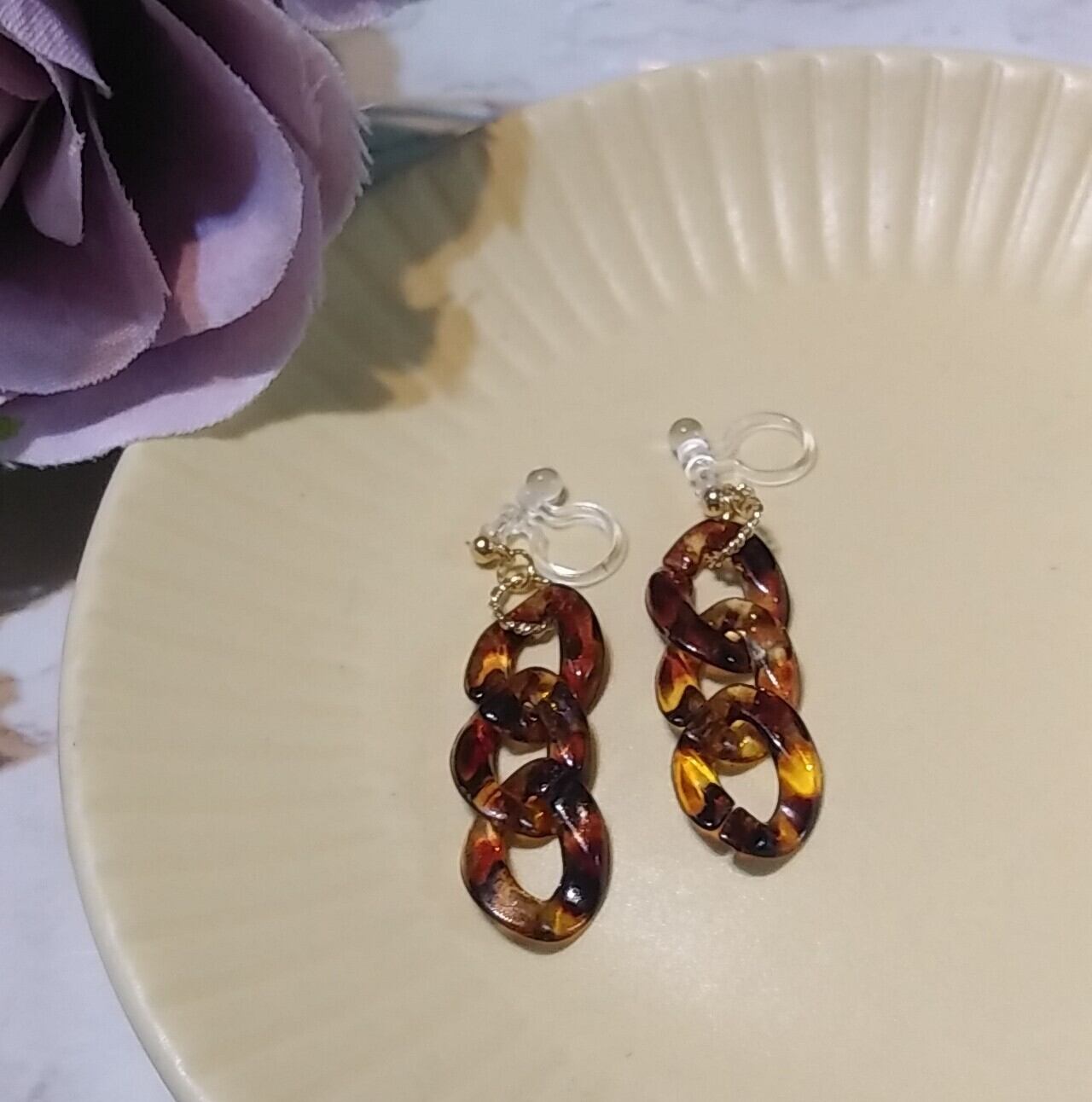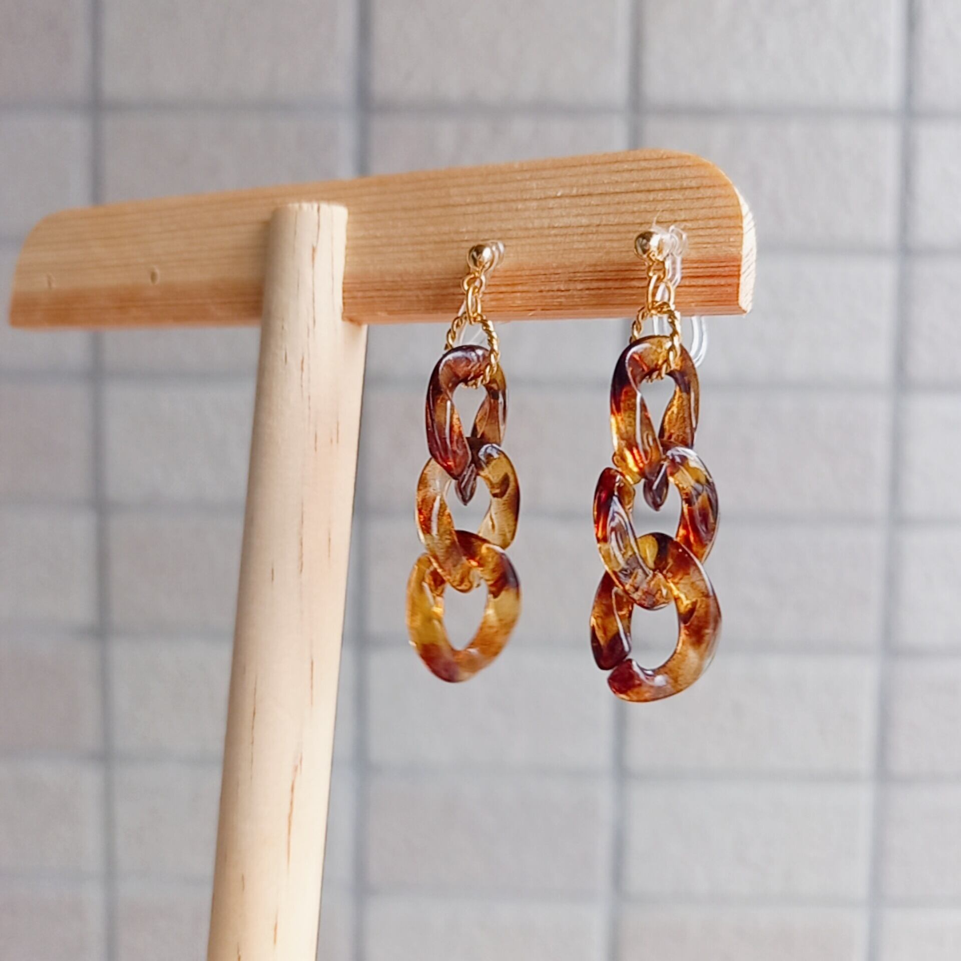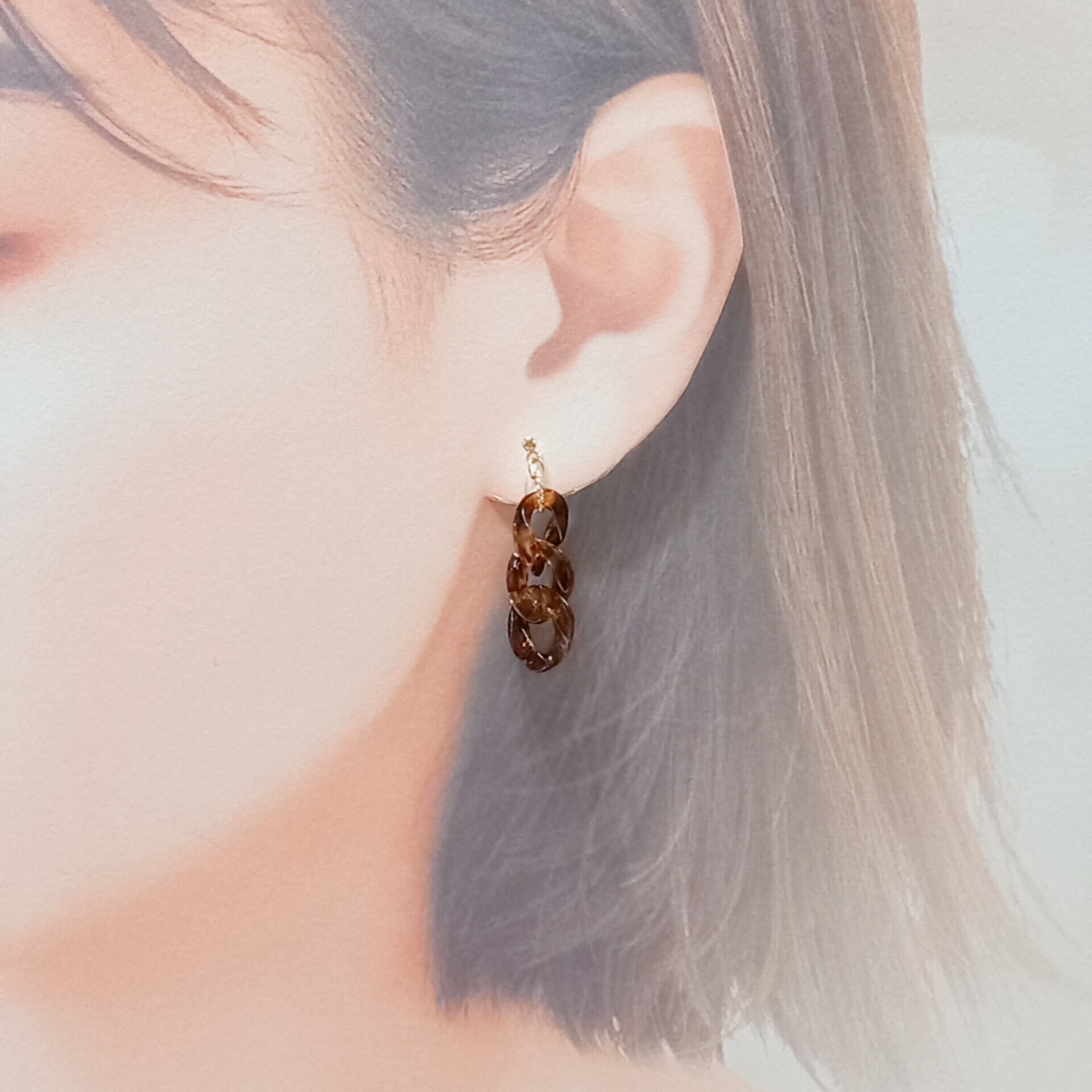 アクリル素材で軽い 鼈甲柄チェーンの3連イヤリングです。