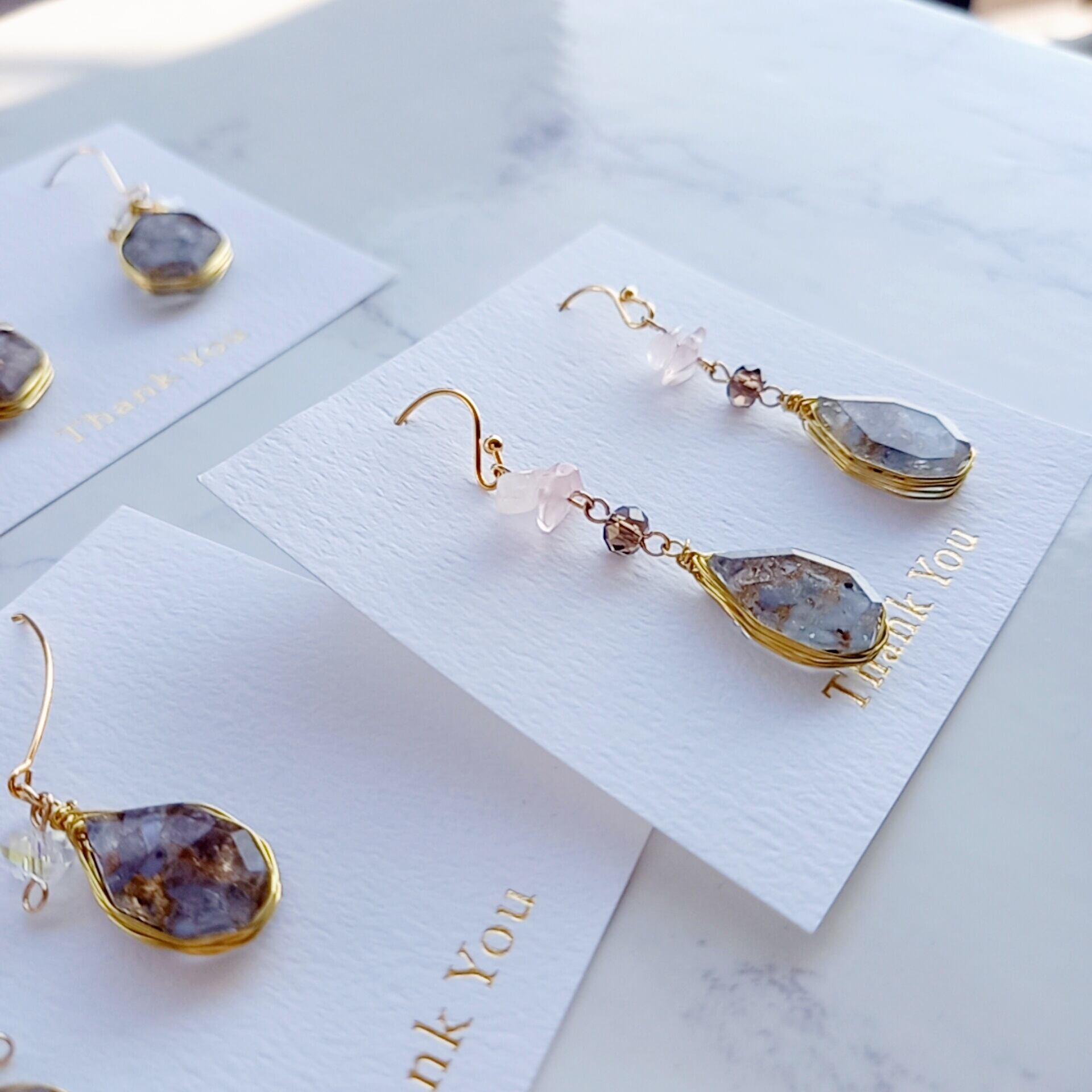 光に反射すると美しく輝くラフスライスカットをゴールドのワイヤーで縁取りしています。