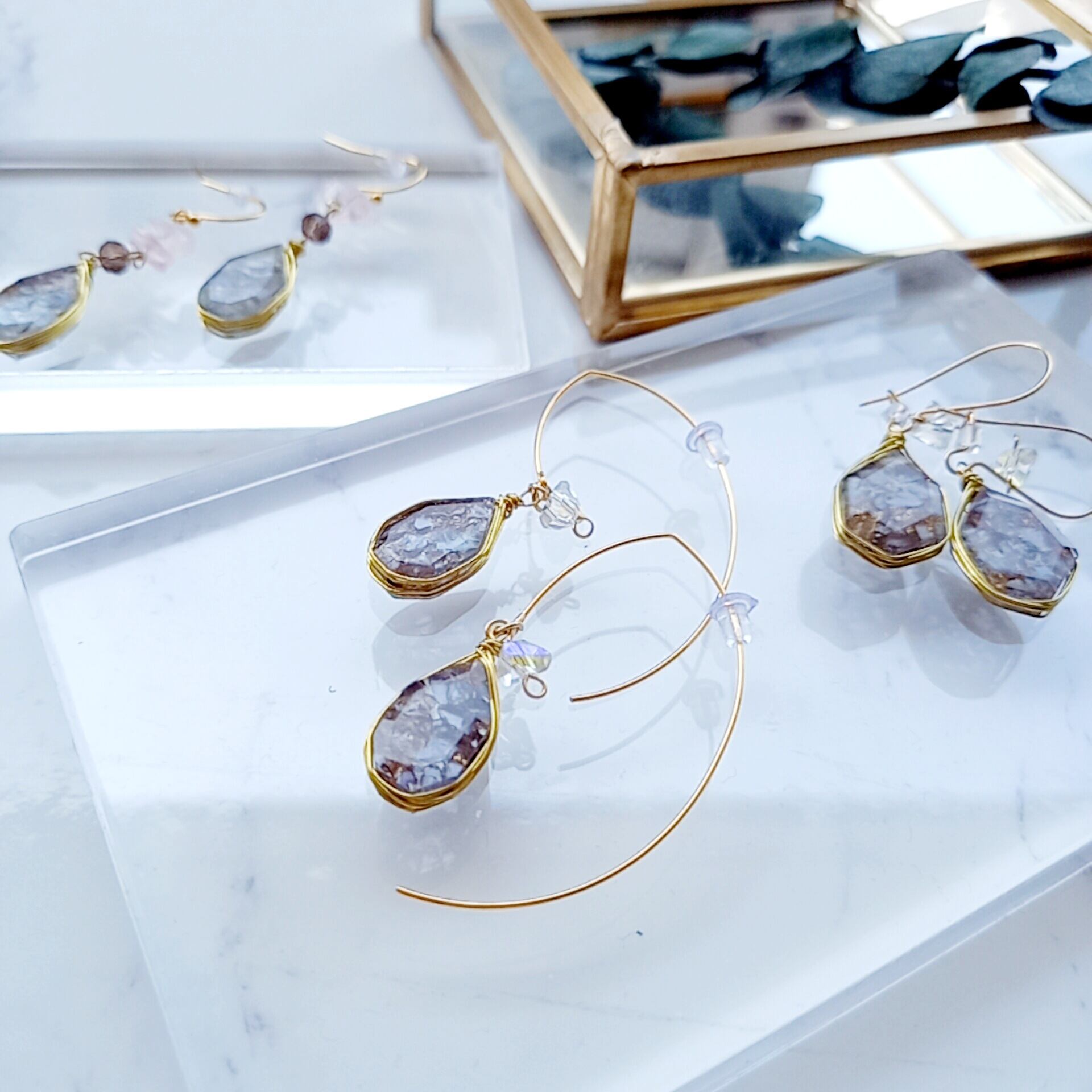 光に反射すると美しく輝くラフスライスカットをゴールドのワイヤーで縁取りしています。